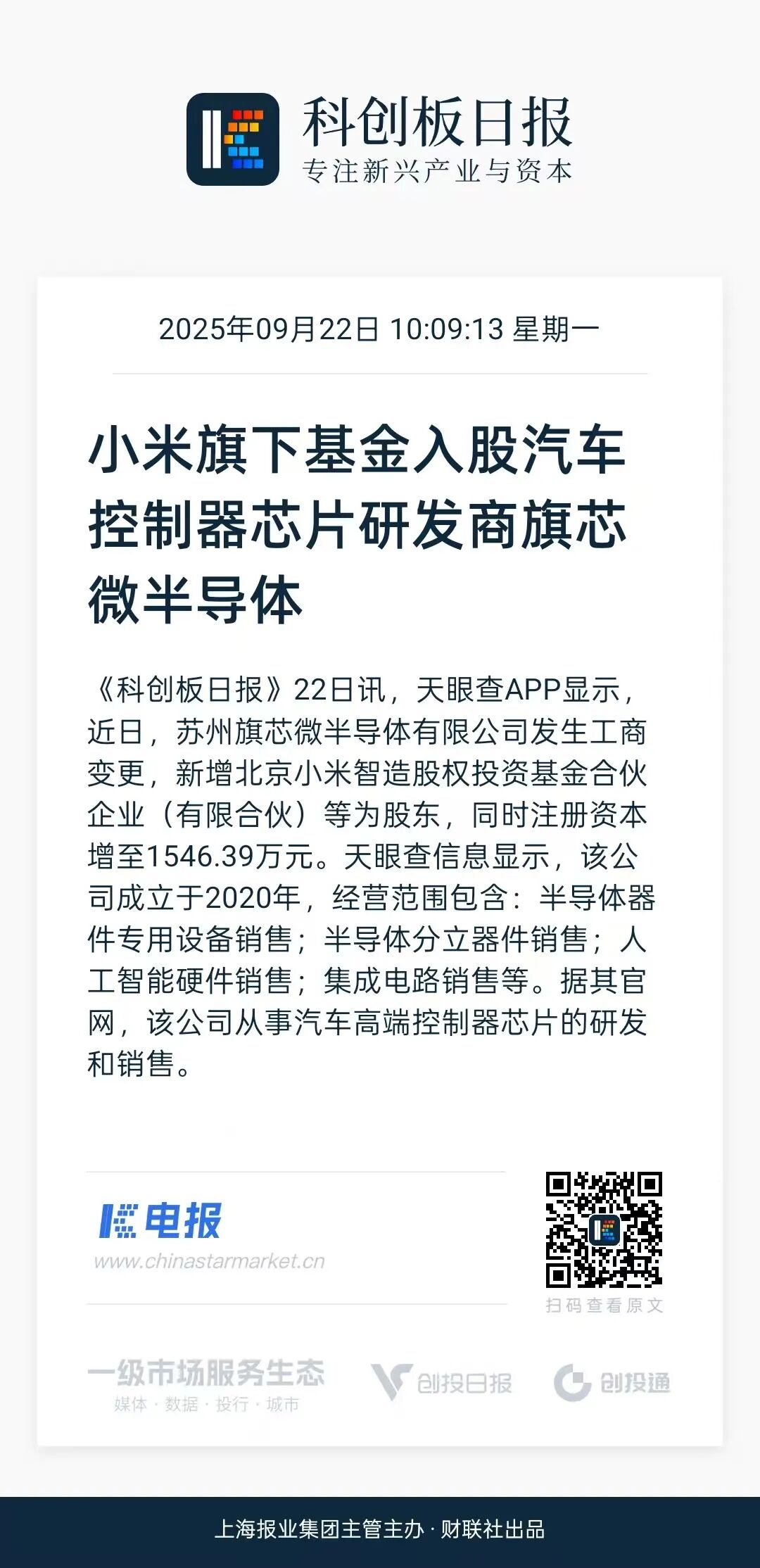 天眼查APP显示,近日,苏州旗芯微半导体有限公司发生工商变更,新增北京小米智造股权投资基金合伙企业(有限合伙)等为股东好多牛,同时注册资本增至1546.39万元。天眼查信息显示,该公司成立于2020年,经营范围包含:半导体器件专用设备销售;半导体分立器件销售;人工智能硬件销售;集成电路销售等。据其官网,该公司从事汽车高端控制器芯片的研发和销售。