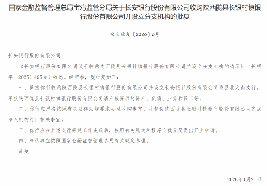 1月26日金融一线消息益牛网,国家金融监督管理总局宝鸡监管分局发布批复,同意长安银行股份有限公司收购陕西陇县长银村镇银行股份有限公司并设立长安银行股份有限公司陇县北大街支行,承接陕西陇县长银村镇银行股份有限公司清产核资后的资产、负债、业务和员工等。